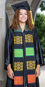 The stole has a black background and three colored striped sections. (From top to bottom). The top section has red and green stripes, the middle section green and gold sections, and the bottom section red and gold sections).
