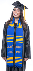 The stole has a royal blue background, royal blue & gold stripes, and letters in gold. "CHICANO STUDIES" is woven on both sides.