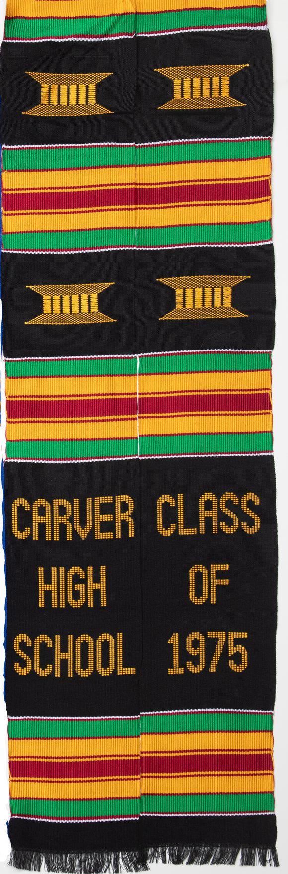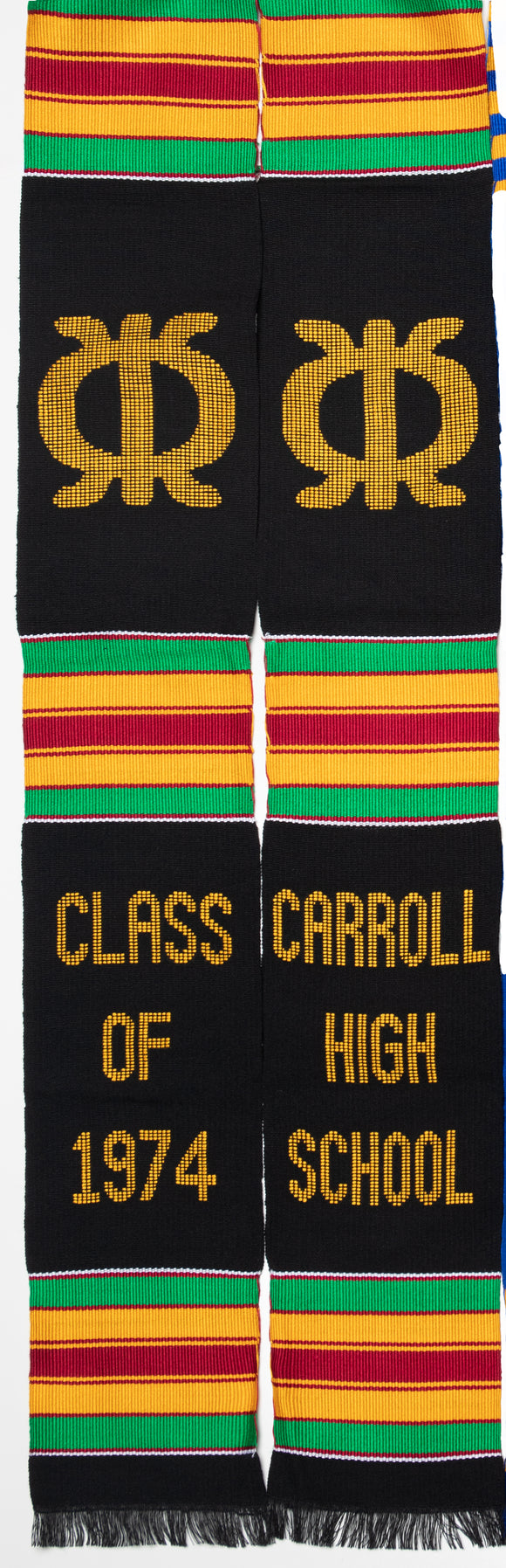 Lettering can be woven up to three (3) lines, with a maximum of ten (10) characters per line on both sides. The stole is approximately 72 in. x 4.5 in. Individually handwoven in Ghana, West Africa.