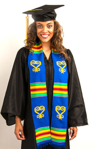 The stole has a royal blue background, red, gold & green stripes, and symbols in gold. The stole is approximately 72 in. x 4.5 in. Individually handwoven in Ghana, West Africa.
