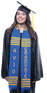The stole has a royal blue background, royal blue & gold stripes, and letters in gold. "AVID" is woven on one side, "GRADUATE" on the opposite side.
