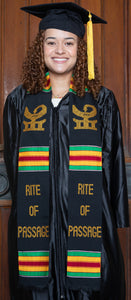 The Sankofa (Go back and take) symbol represents positive reversion and revival. RITE OF PASSAGE is woven on both sides.