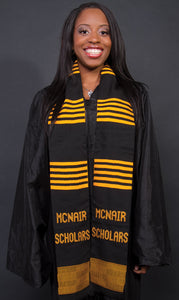 The stole has a black background, black & gold stripes, and letters/symbols in gold. "MCNAIR SCHOLARS" is woven on both sides.