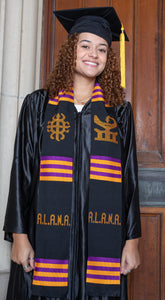 The stole has a black background, purple & gold stripes, and letters/symbols in gold. "A.L.A.N.A." is woven on both sides.